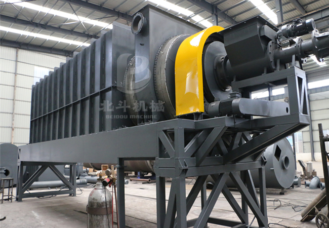 本機(jī)采用滾筒干餾炭化工藝,充分利用炭化過(guò)程中產(chǎn)生的廢煙氣,經(jīng)煙氣回收凈化系統(tǒng)得到再利用。果殼炭化機(jī)內(nèi)部有雙套筒管道,內(nèi)筒為干燥預(yù)熱管道,外筒為高溫炭化管道,利用炭化煙氣對(duì)原料進(jìn)行干燥炭化。同時(shí),果殼的炭化使產(chǎn)品具有初步的活化和一定的碘值,為下一步制備優(yōu)質(zhì)的果殼活性炭打下良好的基礎(chǔ)。