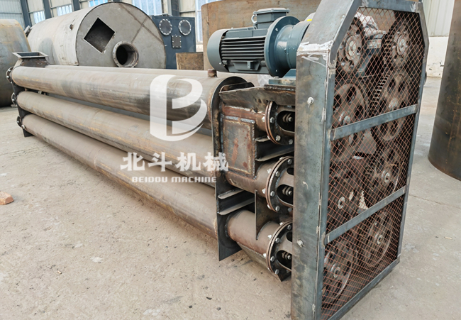冷炭出料機可以達到冷卻物料的目的,減少占用空間。水冷內(nèi)螺旋輸送機包括進料單元、出料單元、筒體、冷卻單元、驅(qū)動單元和支撐單元。進料單元和出料單元分別設(shè)置在筒體兩端,驅(qū)動單元使筒體圍繞中心對稱軸旋轉(zhuǎn),支撐單元支撐筒體。筒體包括外筒體和內(nèi)筒體,進料單元附近的外筒體周圍設(shè)有一定長度的夾套,冷卻套筒從一端進水,從另一端排水,水和炭不接觸,提高了炭的品質(zhì),具有更好的冷炭效率,從而將成品炭的溫度降至常溫。